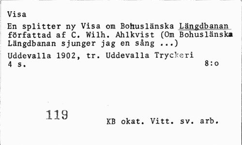 //// Visa //// En splitter ny Visa om Bohuslänska Längdbanan författad af C. Wilh. Ahlkvist (Om Bohuslänsk» Längdbanan sjunger jag en sång ...) //// Uddevalla 1902, tr. Uddevalla Tryckeri 4 s. 8:0 //// 119 //// KB okat. Vitt. sv. arb. ////