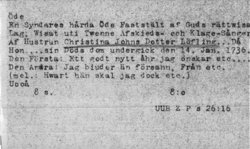 //// Öde . .. . //// En Syndares hårda öde Faatstält a^ Guds rattwisi La g; Wisat uti Twenne Afskieds- ech Klage-«S&ng«] Af Hustrun flhrirtfrrfr lAh.^r..l>.ott»r . //// Hon ..»sin Bods a om undergick d«n 14. Jan. 1/Jo Den Första: Ett god t nytt åfcr jag önskar etc*». Den Aréra: Jag bitidor Un föreann, Frén etc. (mel.: Hwart hän skal jag dock etc.) Uooå „ //// ¦ .8 s. //// UUB £ P s 26 i 16 ////