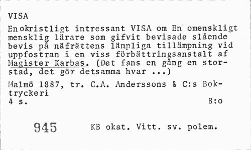 //// VISA //// En okristligt intressant VISA om En omenskligt mensklig lärare som gifvit bevisade slående bevis på näfrättens lämpliga tillämpning vid uppfostran i en viss förbättringsanstalt af Magister Karbas. (Det fans en gång en storstad, det gör detsamma hvar ...) //// Malmö 1887, tr. C.A. Anderssons & C:s Boktryckeri //// 4 s. 8:0 //// 945 okat. Vitt. sv. polem. ////