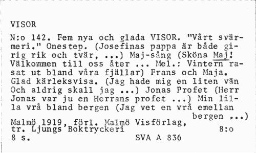 //// VISOR //// N:o 142. Fem nya och glada VISOR. "Vårt svärmeri." Onestep. (Josefinas pappa är både gi-rig rik och tvär, Maj-sång (Sköna Maj.i //// Välkommen till oss åter ... Mel.: Vintern rasat ut bland våra fjällar) Frans och Maja. Glad kärleksvisa. (Jag hade mig en liten vän Och aldrig skall jag ...) Jonas Profet (Herr Jonas var ju en Herrans profet ...) Min lilla vrå bland bergen (Jag vet en vrå emellan //// bergen ...) //// Malmö 1919, förl. Malmö Vis förlag, //// tr. Ljungs Boktryckeri 8:0 //// 8 s. SVA A 836 ////