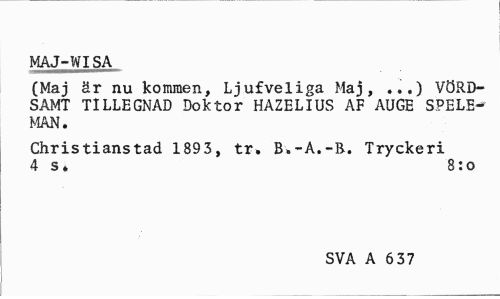 //// MAJ-WISA //// (Maj är nu kommen, Ljufveliga Maj, ...) VÖRDSAMT TILLEGNAD Doktor HAZELIUS AF AUGE SPELEMAN. //// Christianstad 1893, tr. B.-A.-B. Tryckeri 4 s. 8:0 //// SVA A 6 37 ////