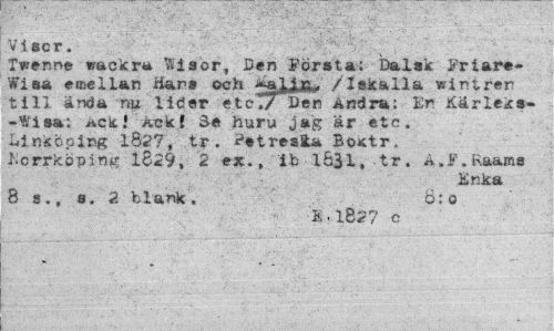 //// Viser. //// Twenne wackra Eiscr, Ben Första; Dalsk Friare-Wisa emellan Hans och ^jjjs». /Iskalla wrintren till ända nu lider etc I/Den Andra: En Kärleks--Wita: Äck.' Ack! Se huru jag är etc. Linköping 1Ö2?, tr . ^etresia Bostr. Norrköping 1629, 2 ex., ib 1631» tr. A.F.Raams //// Kr.ka //// 8 s., s. 2 fclank, o: o //// K. 182? o ////