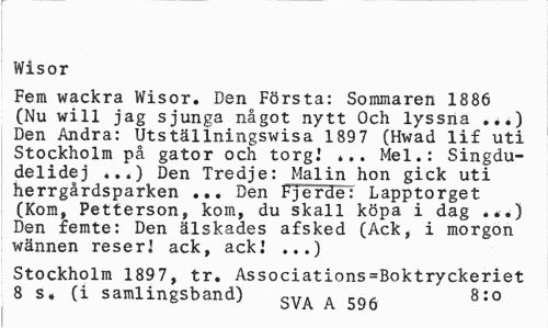 //// Wisor //// Fem wackra Wisor. Den Första: Sommaren 1886 (Nu will jag sjunga något nytt Och lyssna ..?) Den Andra: Utställningswisa 1897 (Hwad lif uti Stockholm på gator och torg.' ... Mel.: Singdu-delidej Den Tredje: Malin hon gick uti //// herrgårdsparken ... Den F jerde: Lapptorget (Kom, Petterson, kom, du skall köpa i dag ...) Den femte: Den älskades afsked (Ack, i morgon wännen reserl ack, ack! ...) //// Stockholm 1897, tr. Associations=Boktryckeriet 8 s« (i samlingsband) SyA A 5Q6 8:o ////