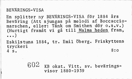 //// BEVÄRINGS-VISA //// En splitter ny BEVÄRINGS-VISA för 1884 års Beväring (Att sjungas på melodi af Boccaccio-marschen, eller: Tänk om Smithen dör o.s.v.) (Hurtigt framåt vi gå till Malma heden fram, //// Eskilstuna 1884, tr. Emil Öberg. Friskyttens tryckeri //// 4 s. 8:o //// 602 //// KB okat. Vitt. sv. bevärings-, visor 1880-1939 ////