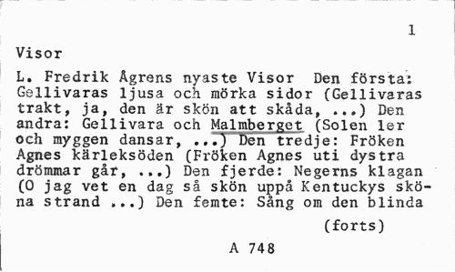 //// 1 //// Visor //// L. Fredrik Ågrens nyaste Visor Den första: Gellivaras ljusa och mörka sidor (Gellivaras trakt, ja, den är skön att skåda, ...) Den andra: Gellivara och Malmberget (Solen ler och myggen dansar, ...) Den tredje: Fröken Agnes kärleksöden (Fröken Agnes uti dystra drömmar går, ...) Den fjerde: Negerns klagan (0 jag vet en dag så skön uppå Kentuckys sköna strand ,..) Den femte: Sång om den blinda //// (forts) //// A 748 ////