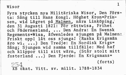 //// Wisor 1 //// Fyra stycken nya Militäriska Wisor, Den Första: Sång till Hans Kongl. Höghet Kronprinsen, wid Lägret på Malmen, nära Linköping,' den 31 Augusti 1821: För rättwisa, Frihet och Fädernesland, ... Den Andra: En Swensk Regements«=Wisa, äfwenledes sjungen på Malmen: Friskt oppl låt oss sjungaJ (Raska Krigsmän äro wi. ...) Den Tredje: En Nordisk Krigs= Sång; Sjungen wid samma tillfälle: Med haf och klippor till sitt wärn, (Står stolt mitt fosterland ...) Den Fjerde: En Krigsmans= //// 4 (forts) //// KB okat. Vitt. sv. milit. 1788-1834 ////
