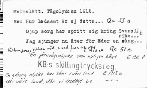 //// Malmslätt. Tågolyckan 1912. //// | Se: Hur ledsamt är ej detta... Qa XJ ct //// Djup sorg har spritt sig kring Sveas3ji //// rike... //// Jag sjunger nu åter för Eder en »ång... //// I ^.6 vU hA 1%57 e //// i ^vtjsoA/cka so* »yfift* £ flg f //// \ KB:s skillingtrycksreg. //// 1a St yras/<j o/yckc kar kewi l**"/ 6 /f/3 a //// Utf'vart faué?, dar vi Se — " ~~ ////