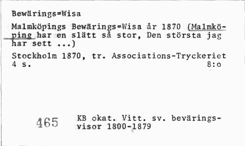 //// Bewärings=Wisa //// Malmköpings BewäringsaWisa år 1870 (Malmköping har en slätt så stor, Den största jag har sett ...) //// Stockholm 1870, tr. Associations-Tryckeriet 4 s. 8:o //// KB okat. Vitt. sv. bevärings-visor 1800-1879 ////