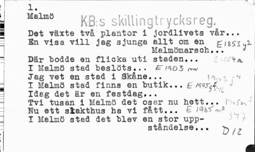 //// 1. //// I Malmö KB:s skillingtrycksreg, //// I Det växte två plantor i jordlivets vår... " En visa vill jag sjunga allt om en £\%si ui. //// Malmömars ch... 3 Där "bodde en flicka uti staden... Va. //// I Malmö stad beslöts... rvw //// Jag vet en stad i Skåne... ; I Malmö stad finns en butik... £ wrX, J " Ideg det är en festdag... //// Tvi tusan i Malmö det osar nu hett... r >jV,-Nu ett slakthus ha vi fått... £ I Malmö stad det blev en stor uppståndelse... //// M ////