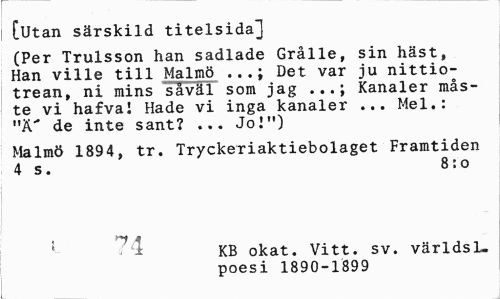 //// I [utan särskild titelsida] //// (Per Trulsson han sadlade Grålle, sin häst, Han ville till Malmö Det var ju nittio- //// trean, ni mins såväl som jag Kanaler mås- //// te vi hafva! Hade vi inga kanaler ... Mel.: "Ä" de inte sant? ... Jo!M) //// Malmö 1894, tr. Tryckeriaktiebolaget Framtiden 4 s. 8:0 //// KB okat. Vitt. sv. världsL. poesi 1890-1899 ////