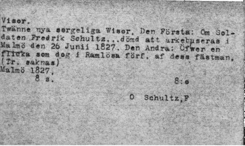 //// Visor. //// Twänne nya sorgeliga l?isor, Den Första: Om Soldaten Fredrik Schultz, , .dömd att *rkebnseraa i Malmö den 26 Junii 1827. Den Andra; GfVer en ftt^ka som dog i RaalÖsa förf, af dess fästman, (Tr. saknas) Malmö 1827, //// Ä s, 8;• //// O Schultz,F ////
