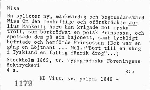 //// Wisa //// En splitter ny, märkwärdig och begrundanswärd Wisa Om den manhaftige och oförskräckte Julius Mankell; huru han krigade mot ryska troll, som bortröfwat en polsk Prinsessa, och spetsade dem på sin bajonett, samt lyckligt befriade och hemförde Prinsessan (Det war en gång en Löjtnant ... Mel.:"Bort till en skog i Tyskland en fattig fänrik drog"...) //// Stockholm 1865, tr. Typografiska Föreningens Boktryckeri //// 4 s. 8:0 //// KB Vitt. sv. polem, 1840 - //// 1179 ////
