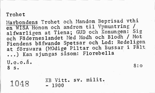 //// Trohet //// Marbondens Trohet och Handom Beprisad vthi en WISA Honom och androm til Vpmuntring / alfwarligen at Tiena; GUD och Konungen: Sig och Fäderneslandet Hed Modh och Blodh / Mot Fiendens bäfwande Spetsar och Lod: Redeligen at förswara (MOdige"Piltar och Bussar i Fält ...) Kan sjungas såsom: Florebella //// U. o»o. å. //// 8 s. 8:0 //// 1fMo Vitt. sv. milit. //// lu^ö - 1900 ////