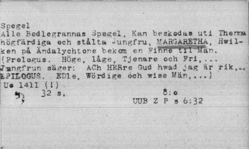 //// Spegel //// Alle Bedlegrannas Spegel. Kan beskodas uti Thenra högfärdiga och stålta Jungfru, MARGARETHA, Hwil-¦cen på Ändalychtone bekom en Finne tfPTän. {Prologus. Höge, lage, Tjenare och Fri,.,, rangfrun sä??er: ACh HKRre Gud hwad jag är rik,., LPIL-OGUS. EDle, Word i ge och wise Män,,..) Ue 1411 (i) //// ^ 32 8. © //// y UUB Z P s 6;32 ////