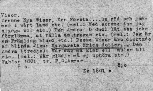 //// Visor. //// Irenn* Nya Wisor, Der Första:...Se nöd och jämmer i wårt land etc. (mel.: Med aorfae ton ja,? sjunga wil etc.) Der Andra; G Gudl lät oss icke. förstörarna, at fälla *n .trogen eto. (wel.: Jag är e*P Främling bland etc.) Desse Wisor äro dicktade af blinda ?igan Margareta Erics dotter... Den Andra (tredje); Slr dttg WrTfSyW^ter- bli. etc. (mel.; Wår glädje mk ej uphöra etr.) Fablur 1Ö01, tr. P.G.Aamar. //// 8 ». tjo //// Zz 1801 e ////