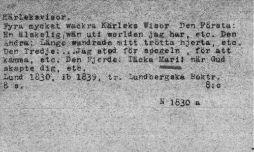 //// Kärleksvisor, //// Pyra mycket w&ckra Kärleks Wisor Pen Första: Sn älsk elig ,wär uti »re rid en jag har, etc. Den Andra; lÅrvge vandrade mitt trötta hjerta, etc. "Der Tredje: .. .Jag stfd för spegeln , för att kamma, etc. Den Fjerde: läcka Mari I när Gud skapfce dig, etc. mmmm //// Lund 1830. ib 1839, tr. Lundbergska Eoktr. & 9. 8;o //// K 1630 a ////