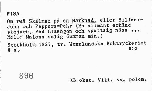 //// WISA //// Om twå Skälmar på en Marknad, eller Silfwer» John och Pappers=Pehr (En allmänt erkänd skojare, Med Glasögon och spettsig näsa Mel.: Malena salig Gumman min.) //// Stockholm 1827, tr. Wennlundska Boktryckeriet 8 sv 8:0 //// 896 //// KB okat. Vitt. sv. polem. ////