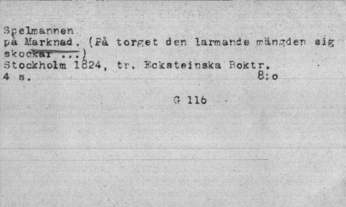 //// Spelmannen //// på Marknad. (På torget den larmande rrän^den sig //// skoctir ...} //// Stockholm 1824, tr. Eckateinska Boktr. 4 s. 8:0 //// a 116 ////