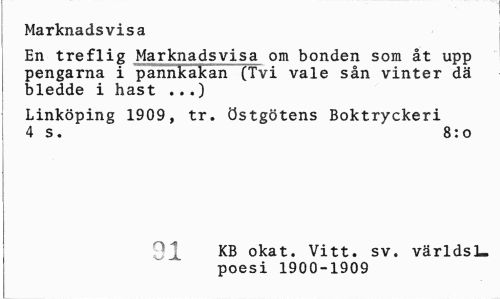 //// Marknadsvisa //// En treflig Marknadsvisa om bonden som åt upp pengarna i pannkakan (Tvi vale sån vinter dä bledde i hast ...) //// Linköping 1909, tr. östgötens Boktryckeri 4 s. 8:0 //// KB okat. Vitt. sv. världsl- //// poesi 1900-1909 ////