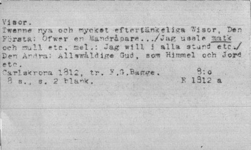 //// Visor. //// Twenne nya och »nye'*st •sftprtänkeliisr* ?<isor, Den Första: Ofwer en Mandråpare. . ./Jag ussle aatk och mull etc. ael.: Jag wl 11 i alla atundf etc./ Ben Åndra: Allsiråldigs -3ud, som Himmel och Jor<* etc . //// CarlaKrora 1812, tr. K ,Bstft«?e . B; o //// B s., s. 2 bla-k. K 1312 a ////