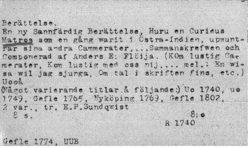 //// Berättelse. //// En ny Sannfärdig Berättelse, Huru en Ourieus Matros som en gång warit 1 Östra-Indien, upmunt-far sj na a"d ra Cammerater, . . .Sammanskrefwen och Compon#»ra?i af Anders E; Flcija. (KOm lustig -ar me rater, Kom lustig mert oss ni j , . .. mel.: Ers wisa wil jag sjunga, Om tal i skriften finst etc.) Uooå . //// QTå 'ot varierande titlar.å följande:) Uo 1740, u© 1749, Gefle 1765, Nyköping 1769, Gefle 180?, 2 var,, tr. E.P.3undqv?ist //// 8 s. 8: o //// R 1740 //// Gefle 1774, UUB ////