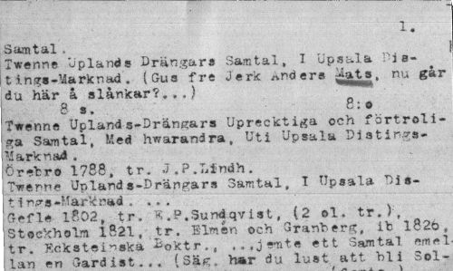 //// 1. //// Samtal, //// Twenne "Jplands Drängar® Samtal, I Upsala Dj s-tings-Marknad. (Gus fre Jerk endera ^ats, nu går du här å siankar?...) //// : 8 a. 8:0 //// Twenne Uplands-Drängara Uprecktiga och förtroliga Samtal, Med hwarandra, Uti Upsala Diatings-lMarknad . //// lörehro 1788, tr. J.P.Lindh. //// I Twenne Uplands-Drängars Samtal, T Upsala Dia-11n^s-Marknad. ... //// Sefle 1802, tr. R.P.Sundqvist, (2 ol. tr,I, Stockholm 1821, tr. Elmén och Granberg, ib l82b, 1 tr. Kcksteinska ^oktr...jemte ett Samtal em el //// 1 (»n ("iairfi i st. I Sär Har* du l-,i*t ut.t hl i ////