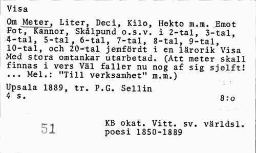 //// Visa //// Om Meter, Liter, Deci, Kilo, Hekto m.m. Emot Fot, Kannor, Skålpund o.s.v. i 2-tal, 3-tal, 4-tal, 5-tal, 6-tal, 7-tal, 8-tal, 9-tal, 10-tal, och 20-~tal jemfördt i en lärorik Visa Med stora omtankar utarbetad. (Att meter skall finnas i vers Väl faller nu nog af sig sjelft! ... Mel.: "Till verksamhet" m.m.) //// Upsala 1889, tr. P.G. Sellin 4 s. 8: o //// KB okat. Vitt. sv. världsl. //// poesi 1850-1889 ////