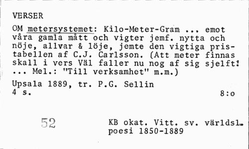 //// VERSER //// OM metersystemet: Kilo-Meter-Gram ... emot våra gamla mått och vigter jemf. nytta och nöje, allvar & löje, jemte den vigtiga pristabellen af C.J. Carlsson. (Att meter finnas skall i vers Väl faller nu nog af sig sjelftJ ... Mel.: "Till verksamhet" m.m.) //// Upsala 1889, tr. P.G. Sellin 4 s. 8:0 //// KB okat. Vitt. sv. världsl. //// poesi 1850-1889 ////