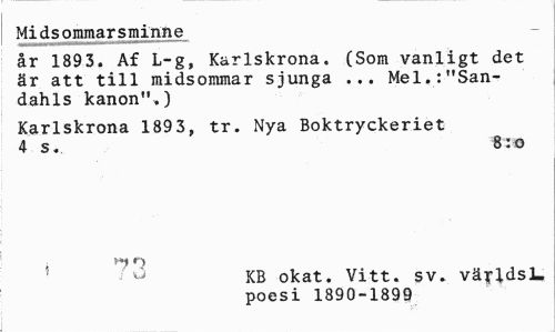 //// Midsommarsminne //// år 1893. Af L-g, Karlskrona. (Som vanligt det är att till midsommar sjunga ... Mel,:"Sandahls kanon".) //// Karlskrona 189 3, tr. Nya Boktryckeriet 4 s. 8:o //// KB okat. Vitt. sv. väyldsL. //// poesi 1890-1899 ////