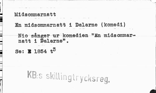 //// j Midsommarnatt //// : En midsommarnatt i Dalarne (komedi) //// 1 Nio sånger ur komedien "En midsommarnatt i Dalarne". //// j Se: B 1854 t5 //// - KB:S skillingtrycksreg. ////