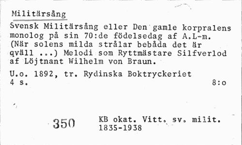 //// Militärsång //// Svensk Militärsång eller Den gamle korpralens monolog på sin 70:de födelsedag af A.L-m. (När solens milda strålar bebåda det är qväll .„.) Melodi som Ryttmästare Silfverlod af Löjtnant Wilhelm von Braun. //// U.o. 1892, tr. Rydinska Boktryckeriet 4 s. 8:0 //// ') //// ocrn KB okat. Vitt, sv, milit. //// 1835-1938 ////