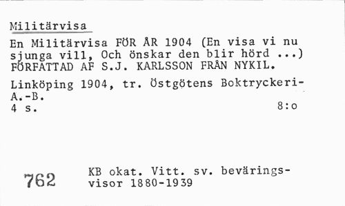 //// Militärvisa //// En Militärvisa FÖR ÄR 1904 (En visa vi nu sjunga vill, Och önskar den blir hörd ...) FÖRFATTAD AF S.J. KARLSSON FRÄN NYKIL. //// Linköping 1904, tr. Östgötens Boktryckeri-A.-B. //// 4 s. 8: o //// KB okat. Vitt. sv. bevärings- //// 783 visor 1880-1939 ////