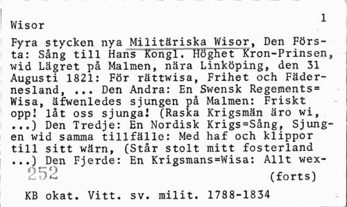 //// Wisor 1 //// Fyra stycken nya Militäriska Wisor, Den Första: Sång till Haris~Kongl. Höghet Kron-Prinsen, wid Lägret på Malmen, nära Linköping, den 31 Augusti 1821: För rättwisa, Frihet och Fädernesland, ... Den Andra: En Swensk Regements= Wisa, äfwenledes sjungen på Malmen: Friskt opp! låt oss sjunga! (Raska Krigsmän äro wi, ...) Den Tredje: En Nordisk Krigs=Sång, Sjungen wid samma tillfälle: Med haf och klippor till sitt wärn, (Står stolt mitt fosterland //// ...) Den Fjerde: En Krigsmans=Wisa: Allt wex- //// c r.; 9 //// (forts) //// KB okat. Vitt. sv. milit. 1788-1834 ////