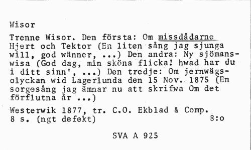 //// Wisor //// Trenne Wisor. Den första: Om missdådarne Hjert och Tektor (En liten sång jag sjunga will, god wänner, ...) Den andra: Ny sjömans-wisa (God dag, min sköna flicka.' hwad har du i ditt sinn', ...) Den tredje: Om jernwägs-olyckan wid Lagerlunda den 15 Nov. 1875 (En sorgesång jag ämnar nu att skrifwa Om det förflutna år ...) //// Westerwik 1877, tr. C.O. Ekblad & Comp. //// 8 s. (ngt defekt) 8:o //// SVA A 925 ////