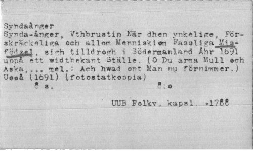 //// Synd&ån^er //// Synda-ånger, /thbrustin Kär dhen ynkelifte, Förskräckliga och allom M«nnlski«m Fassliga Mia» fftdpj , si rh tilldrop-h i Södermanland Åhr 1691 uopaett wid trekant Ställe. (0 Du awa Mull och Aska,.,» mel»: Ach hwad ont Man nu förnimmer,) Uoe& (1691) Cfotostatkoopia) //// 8 s . B: o //// ' UUB Folkv kaps 1, -17fifi ////