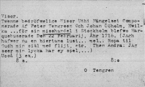 //// Visor. //// Twenne bedröfwelige "isor Ut. hl Fängelset P em Donerade Af Peter Ten*?reen Och Johan Ööholm, Hwil-ka ...för sin misshandel i Stockholm blefwo Har-quebuserade Deri"" 72 ' Feflruarij , Åhr 1716. (JAgh hafwer r,u en hiertans lust... mel.; Ropa til "rudh min siäl med flijt, etc. Then Andra: JAg seer min lycka har ey spel,...) Uooå (3 ex.) //// 8 s. 8:e //// 0 Tengren ////