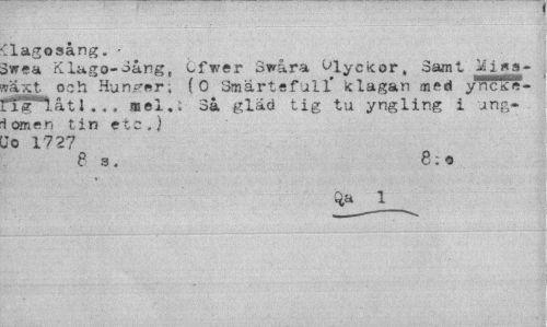 //// klagosång. • //// 5wea Klugo-Sång, tfwer Swåra ^lyckor, Samt Mjqa-växt och Hun/r«r; (0 Sm ärt ef ull' Klagan med yno: e-rig*låti... mel. ; Sa glad tig tu yngling i ungdomen tin etc.) Jo 1727 //// 8s. 8:0 //// * //// qa 1 //// ... ... ¦¦-•V-— - ' ,-'¦•. ¦ ¦'•.'.¦ '. ¦ v ' ' ¦:¦¦ •¦'""¦' v.' ////