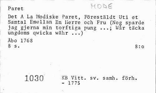 //// Paret HOIig //// Det A La Modiske Paret, Förestäldt Uti et Samtal Emellan En Herre och Fru (Nog sparde JaS gjerna min torftiga pung ...; V/år täcka ungdoms qv^icka währ ...) //// Åbo 1768 //// 8 s. 8:0 //// 1030 KB vitt- sv- samh- förh« //// - 1775 ////
