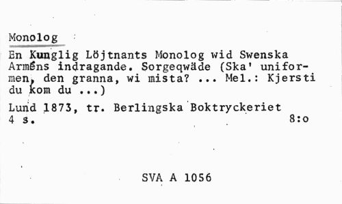 //// Monolog //// En Kunglig Löjtnants Monolog wid Swenska Arméns indragande. Sorgeqwäde (Ska* uniformen. den granna, wi mista? ... Mel.: Kjersti du kom du ...) //// Lund 1873, tr. Berlingska Boktryckeriet 4 3. 8:0 //// SVA A 1056 ////