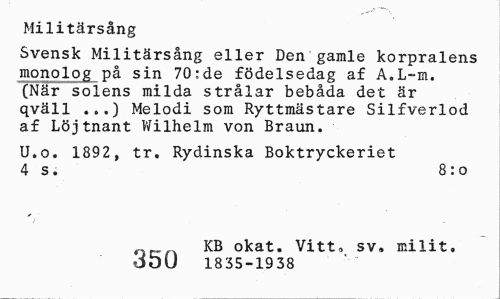 //// Militärsång //// Svensk Militärsång eller Den gamle korpralens monolog på sin 70:de födelsedag af A.L-m. (När solens milda strålar bebåda det är qväll .,.) Melodi som Ryttmästare Silfverlod af Löjtnant Wilhelm von Braun. //// U.o. 1892, tr. Rydinska Boktryckeriet 4 s. 8:0 //// KB okat. Vitt, sv, milit. //// OOU 1835-1938 ////