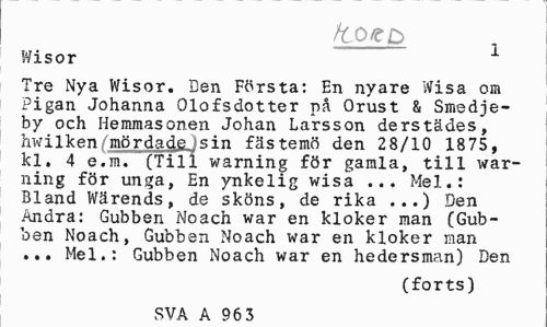//// ItOfCö //// Wisor 1 //// Tre Nya Wisor. Den Första: En nyare Wisa om Pigan Johanna Olofsdotter på Orust & Smedje-by och Hemmasonen Johan Larsson derstädes, hwilken/mördadejsin fästemö den 28/10 1875, kl. 4 e.m. (Till warning för gamla, till war-ning för unga, En ynkelig wisa ... Mel.: Bland Wärends, de sköns, de rika ...) Den Andra: Gubben Noach war en kloker man (Gubben Noach, Gubben Noach war en kloker man ... Mel.: Gubben Noach war en hedersman) Den //// (forts) //// SVA A 96 3 ////