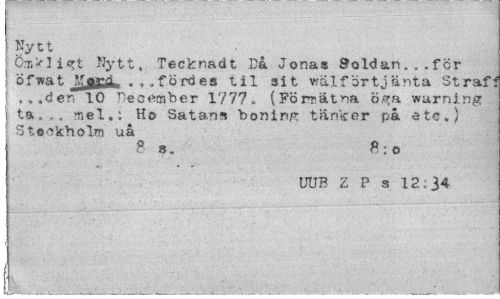 //// ) Nytt //// ö.T»>li«;t Nytt, Tecknad t Då Jonas Soldan...fcr j öfwat Jjjff** ...fördes til sit välförtjänta Strafl . ..den 10 December 1777 . (Förrätna öga warning ta„.. mel.: Ho Satans boning tänker på etc.} Stockholm uå //// B s. //// UUB Z P s 12:34 //// I ////