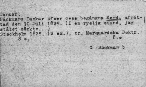 //// i -."it-->¦ " ' v. --. - ^^^ //// ' ¦ " •¦ "¦ -* • ¦• //// -n ¦¦¦'• >. - ¦•- V ¦•• . ¦ //// Tankar. //// Räckmans Tankar öfwer dess begångna M^y^: afrät-tad den 30 Juli 182*. (I en ryslig stund, jag stålet sänkte...) //// Stockholm 1825. (2 ex.), tr. Marquardska Boktr. 8 s. 8;o //// 0 Bäckman b ////