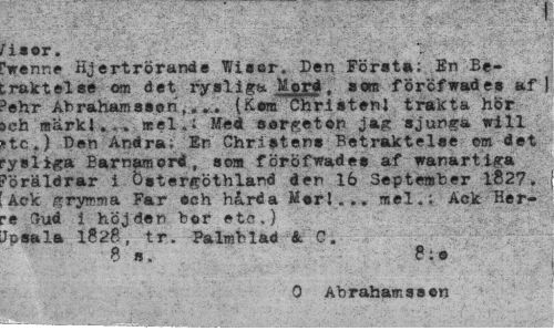 //// - ' -V- - ¦ - ' . ".V-;-^ * //// v .v ,.-"•¦'¦ ",.';". 3-A ¦;¦..¦•" " 4, c,.': f y //// i«or. //// 'wenr.e Hj ert rörand o Wisor. Den Först»; En Be-.raktels» om det rysliga Mord, »em förcfwade» af} >ehr Åbrahamsseh,*», (Kom Christen} trakta hör >eh markl. . . melMed sorleton jag sjunga will ftc») Den Andra; In Christen» Betraktelse em det ¦ysliga Barnamord, som föröfwade* af vanartiga 'öräldrar i östergöthland den 16 September 1827, Ack grymma Far och hårda Mor!... mel.; Ack Her-•e (rud i höjden hor etc.) I c sa la 1828, tr. Palmblad 4 C. //// 8 ». 8:0 //// 0 Abrahamsson ////