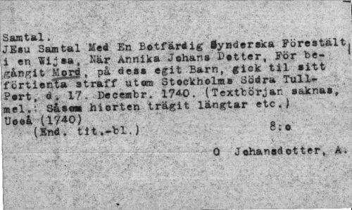 //// Samtal. //// JEau Samtal Med En Botfärdig iynderska Förestält i en Wijaa, Här Annika Jehans Detter, För be-gångit M. på desa egit Barn, gick til eitt förtientoiatraff utom Stockhelma Södra Tull» ?ert, d. 17- Decembr, 17*0. (Textbörjan saknas, mel.'. Så se» hi orten trägit längtar etc.) Ueeå (17^0) //// (End. tit.-bl.) 8; o //// | iiAwf H . ¦ v.' .' :: : ¦ - A. //// O Jehanadotter, A. //// i ' , , v*.;', 7?\ :> .. . '-v' ' K >': -:. ', ' . 4 • , ' ~... . v ^ //// I'®} y'; y yyy+Måt ////