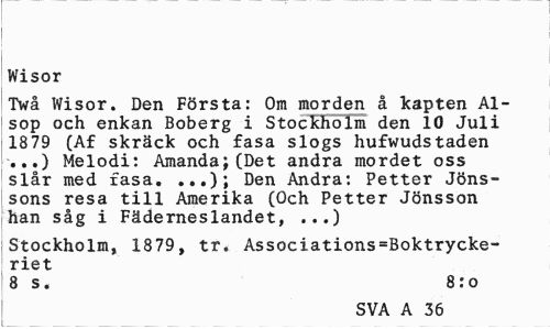 //// Wisor //// Twå Wisor. Den Första: Om morden å kapten Al-sop och enkan Boberg i StocTOTöTm den 10 Juli 1879 (Af skräck och fasa slogs hufwudstaden ...) Melodi: Amanda;(Det andra mordet oss slår med fasa. ...); Den Andra: Petter Jönssons resa till Amerika (Och Petter Jönsson han såg i Fäderneslandet, ...) //// Stockholm, 1879, tr. Associations=Boktrycke-riet //// 8 s. 8:o //// SVA A 36 ////