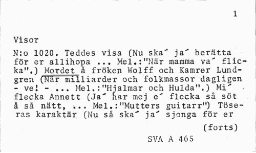 //// 1 //// Visor //// N:o 1020. Teddes visa (Nu ska" ja" berätta för er allihopa ... Mel.:"När mamma va" flicka".) Mordet å fröken Wolff och Kamrer Lundgren (islår milliarder och folkmassor dagligen - ve I - ... Mel.:"Hjalmar och Hulda".) Mi" flecka Annett (Ja" har mej e" flecka så söt å så nätt, ... Mel.:"Mutters guitarr") Töseras karaktär (Nu så ska" ja" sjonga för er //// (forts) //// SVA A 465 ////