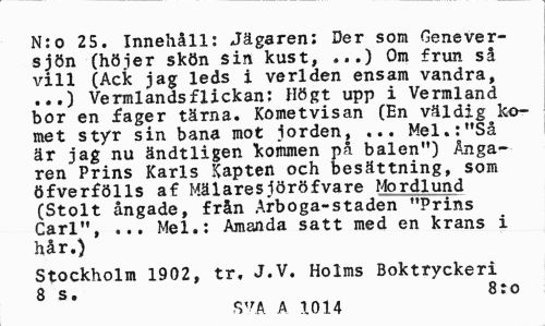 //// N:o 25. Innehåll: Jägaren: Der som Genever-sjön (höjer skön sin kust, ...) Om frun så vill (Ack jag leds i veriden ensam vandra, ...) Vermlandsflickan: Högt upp i Vermland bor en fager tärna. Kometvisan (En väldig komet styr sin bana mot iorden, ... Mel.:"Så är jag nu ändtligen kommen på balen") Ängaren Prins Karls Kapten och besättning, som öfverfölls af Mälaresiöröfvare Mordlund (Stolt ångade, från Arboga-staden "Prins Carl", ... Mel.: Amanda satt med en krans i hår.) //// Stockholm 1902, tr, J.V. Holms Boktryckeri 8 s. 8:o //// SVA A 1014 ////