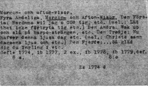 //// - f „• > t . v'-v //// sloretcn- och aftoE-vi$or. , , - . //// ?yr» And el i t?a, Mgrfdr» och AftondiDer Första; Berömma til 'Jag o GUd tig, eto. f»el.; %Ät thet lek* f§rtryt* tig etc.) Den Andra;, Wak UP • »eh slå på harpQ-strängen, »to-. tJen Tredje*. Nu aafwer denna ljusa dag etc. {mel»; Christe sann Jaf««n'a ljus och etc.) Pen Fj er«?e; .., 3å gläd //// du Yn^lin* i et-. ' Sfctte 1774, ib 1777, 2 ex., ib 1778, tb 177?,<ief\ : 8 6:o //// • v ¦¦¦ - ' : ; ¦ //// Z* 1774 d //// i m^^SKmmB^ M PBPPP™»™^ ////