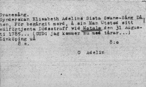 //// Svanesång. //// Synd er»kan Elisabeth Adelins Sista Swane-S&ng Da nsn. För begångit mord, å sin Man Utstod sitt I wälförtjenta Dödsstraff wid Mytala den 31 Augusti 1785... jGUDJ jag kommer t'u rasa tårar...) Linköping uå //// 8s. 8; o //// O Adelin //// f» ////